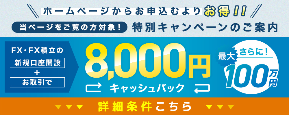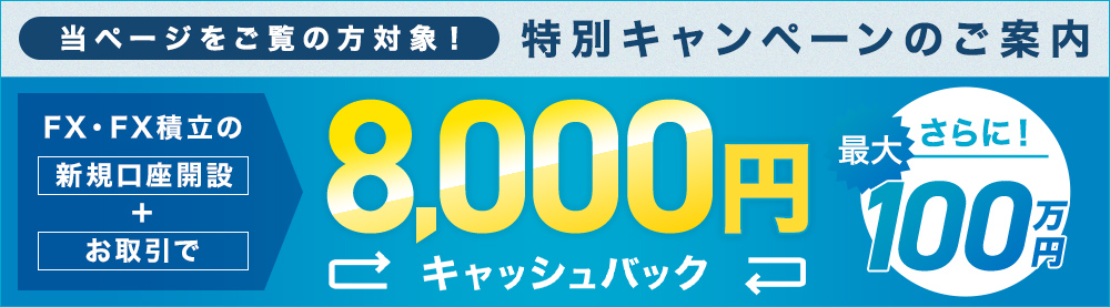 • 当ページ経由のFX及びFX積立の新規口座開設に加え、所定のお取引を行ったお客様にもれなく最大8,000円をキャッシュバック!