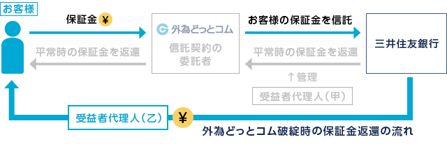 受益者代理人(乙)を通じて、信託財産の範囲内でお客様の資産の額に応じた額(※)の返還をお受けいただけるようになっております。 なお、お客様が信託銀行に対し保証金等の支払いを直接的にご請求いただくことはできませんので、ご注意のほどお願いいたします。 (※返還される金額は、ポジションの清算を行ない、諸費用を控除したうえで、配分すべき金額を確定いたします)