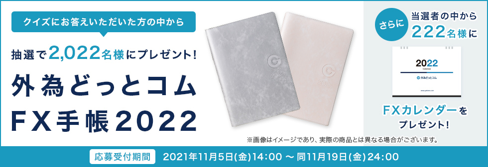 | 賞品・当選者数 | 外為どっとコム謹製『外為どっとコムFX手帳2022』:2,022名様 外為どっとコム謹製『外為どっとコムFXカレンダー2022』:手帳当選者様の中から222名様 |