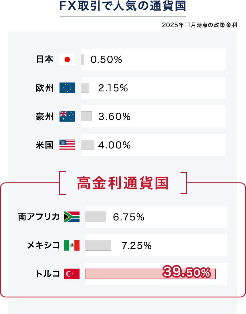 また、トルコ中銀は2023年6月に積極的な利上げに転じ、2024年3月には政策金利を50.00%にまで引き上げた後、2025年11月時点では39.50%となっています。