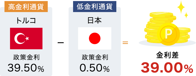 トルコリラのような政策金利が高い国の通貨を買い、日本のような政策金利が低い国の通貨を売ると、差額を受け取ることができます。