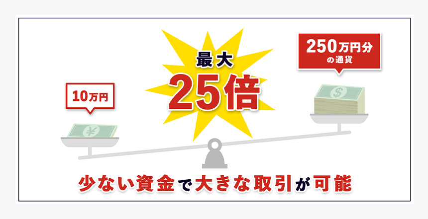 FXでは、最大25倍(個人の場合)の取引ができるメリットがあります。