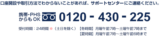 ※午後11時~午前7時(夏時間の土曜日は午前6時)までは、ユーザーID(口座番号)忘れ、パスワード忘れ、アカウントロックの解除などアカウント関連のお問い合わせのみ受け付けております(なお、ログインサポートでも受け付けております)。