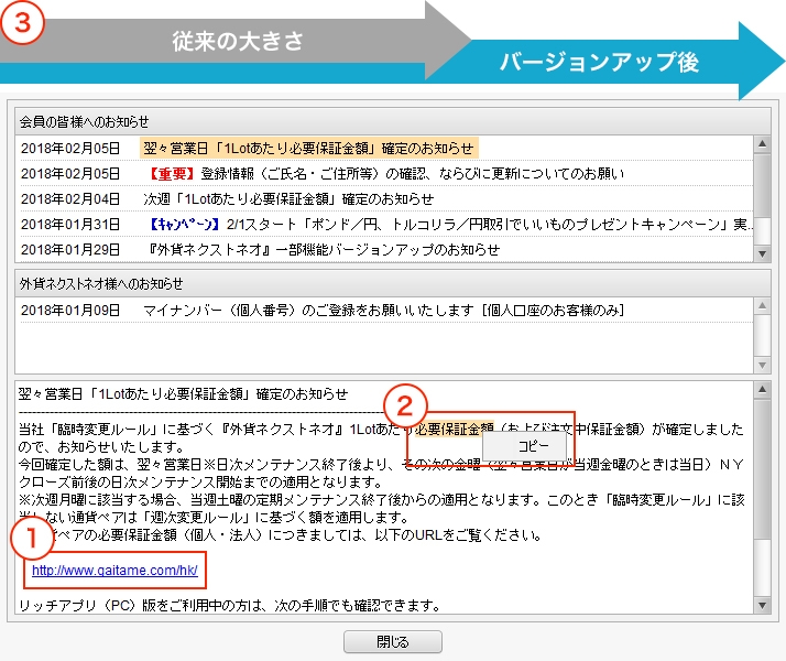 お知らせ画面のリンクをクリックできるようにしました。同時に表示画面の拡大化と本文をコピーできるようにしました。