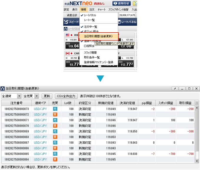 トレード画面に表示されない履歴も含め、当日の全履歴(最大10,000件)のCSV出力も可能です。