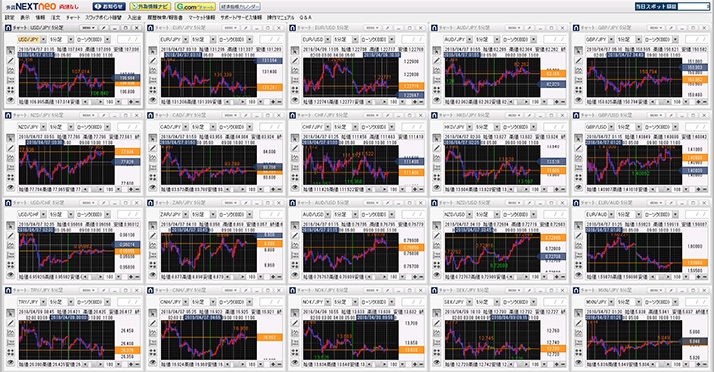 最大表示可能数を6画面から20画面まで増やしました。複数の通貨ペアと足種を一度に表示できます。