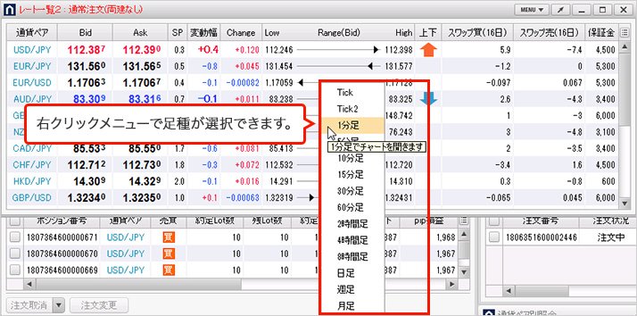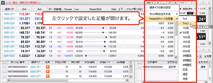 また、右上の「MENU」から「Rangeのチャートの足種」で設定した足種を左クリックで開くこともできます。