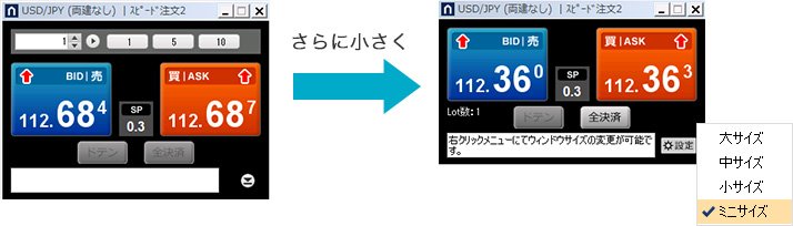 発注ボタンとメッセージのみのミニサイズを用意しました。画面上の右クリックメニューにてウィンドウサイズの変更が可能です。