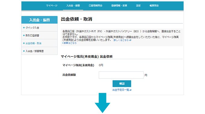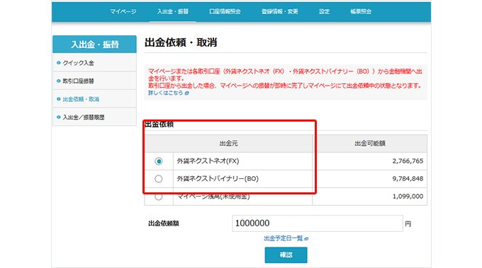 外貨ネクストネオ(FX)・外貨ネクストバイナリー(BO)から直接出金できるようにしました。(マイページ)
