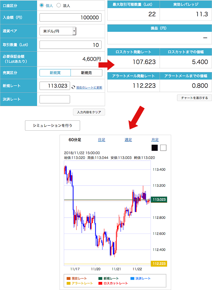 ロスカットまでの値幅計算や、損益シミュレーションができるようになりました。また、グラフ機能も搭載しているため、視覚的にもイメージがしやすくなりました。