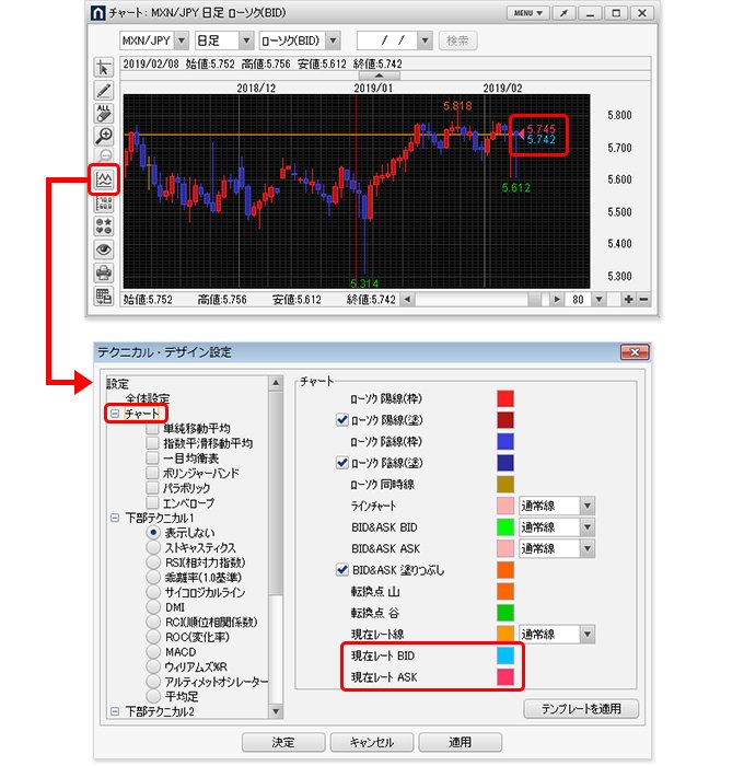 チャートにBIDとASKの現在レートを同時に表示できるようにしました。例えば、ローソク(BID)のチャートを見ながらASKの現在レートも見れるので、チャートタイプを切り替えずに現在のBIDとASKレートを確認することができます。