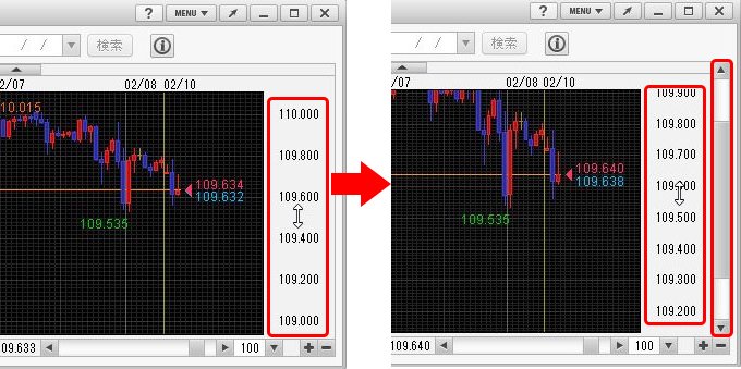 チャートの縦軸(レート)をドラッグすることで上下の幅を変更できるようにしました。拡大時にはスクロールバーが表示され、画面に表示されていない領域も見ることができます。