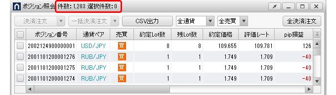 ポジション照会のタイトル横にポジション件数などを表示しました。選択した件数での残Lot数や評価損益が一目で分かり、発注前の参考情報としてお役立ていただけます。