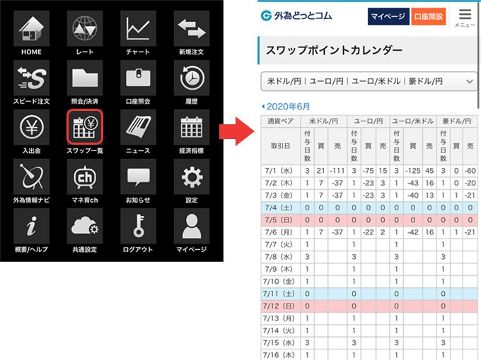 メニュー画面内に『スワップ一覧』のアイコンを追加し、スマートフォンから『スワップポイントカレンダー』を閲覧できるようにしました。