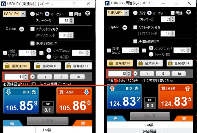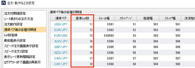 各注文画面で通貨ペアを変更した際に、[通貨ペア毎の各種初期値]で設定した基準Lot数が反映されるようになりました。