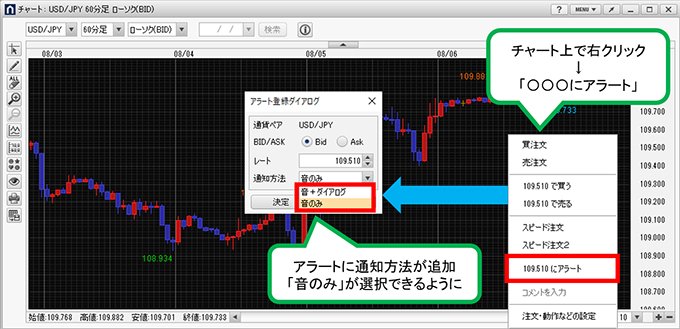 ネオチャートのアラート機能の通知方法に「音のみ」を追加し、操作を止めることなく分析や取引を続行できるようになりました。