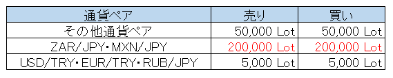 ZAR/JPY・MXN/JPYは200,000Lot、USD/TRY・EUR/TRY・RUB/JPYは5,000Lot、その他通貨ペアは50,000Lot