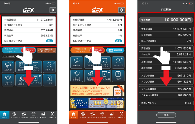 「ホーム」画面、「口座照会」画面を引っ張り下げることで手動更新できるようになりました。