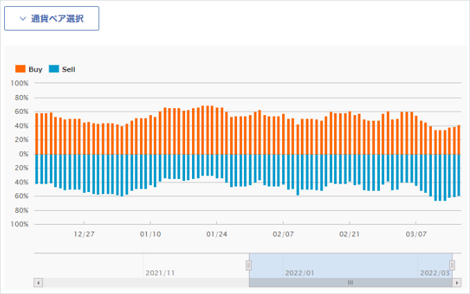 「ポジション比率情報」は、外為どっとコムでお取引をされているお客様の毎営業日クローズ時点で保有されている売り・買いポジションのバランスを表しています。