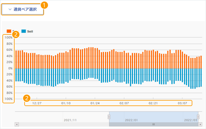 ポジション比率を表しています。「0」を基準に、買(Buy)を上方向、売(Sell)を下方向に表示。【横軸】