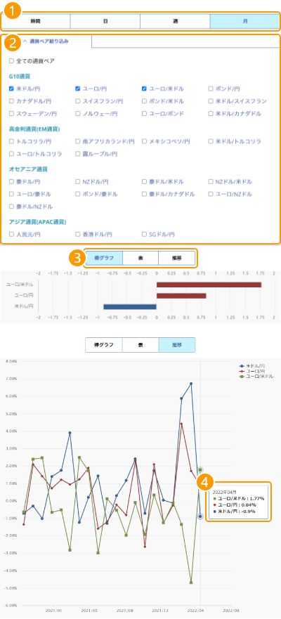 特長2:騰落率の推移から通貨ペアの動きを把握