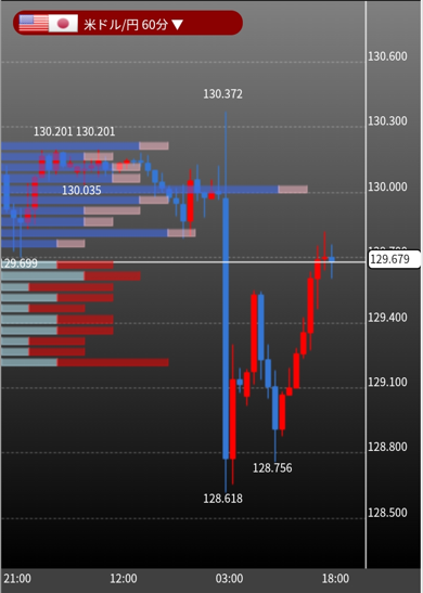 現在値より上には、130.000円に厚い売りオーダーがあり、129.800円アッパーにも並びつつある。また、現在値より下は抵抗帯となる厚い買いオーダーはない。買いオーダーは昨日のパウエル議長会見での下落ですべて消化した模様。