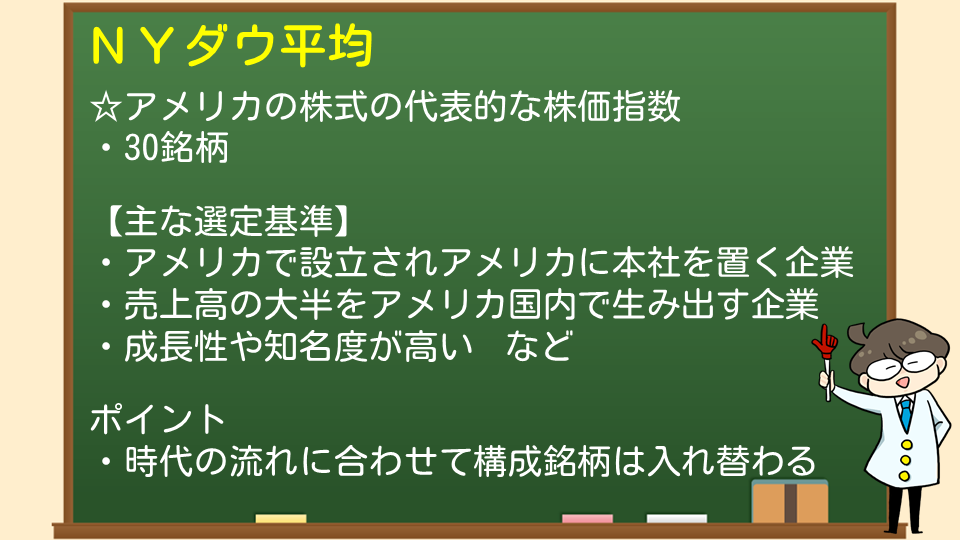 ちなみに、アメリカの株価といえば『NY(ニューヨーク)ダウ』『S&P500(エスアンドピー)』だけど、その特徴をざっくりまとめたのだ