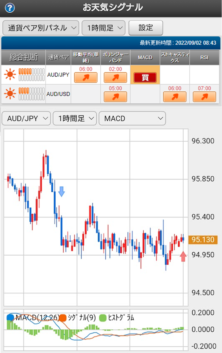 外為どっとコムのテクニカル分析ツール「ぴたんこテクニカル」の「お天気シグナル」では豪ドル/円、豪ドル/米ドルともに晴れ。8時に豪ドル/円のMACDで買いシグナル点灯。