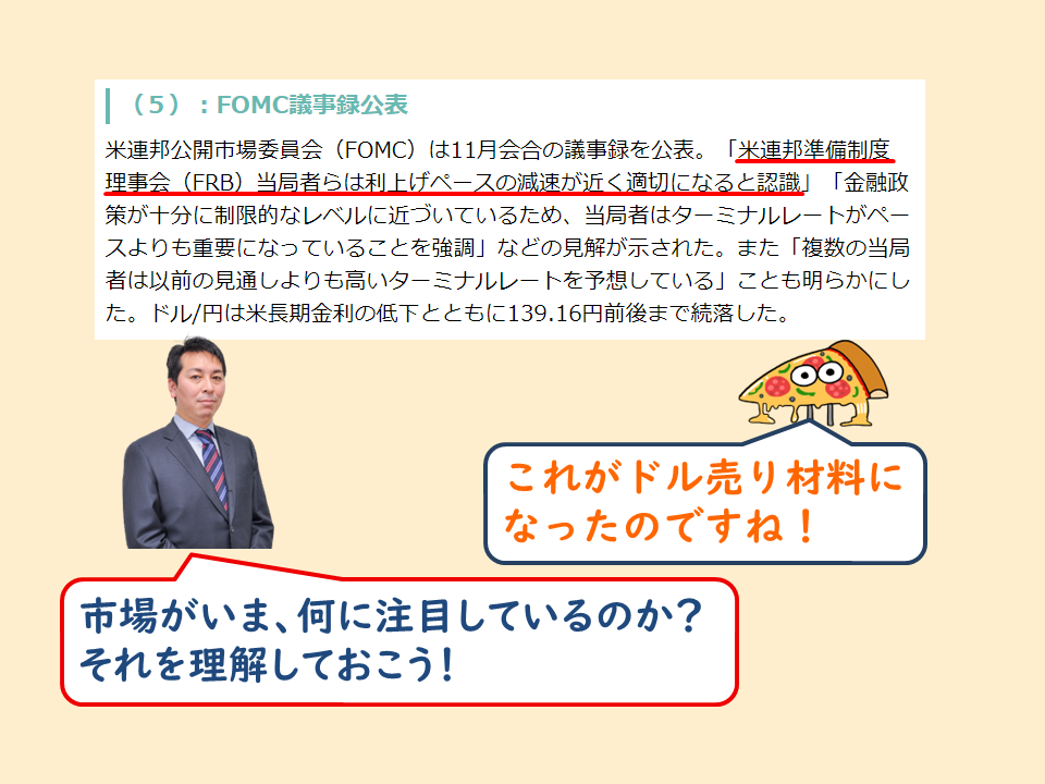 - この時、FRBは6月以降4会合連続で0.75%の大幅利上げを実施していたんだけど、市場では「12月に利上げ幅を縮小するのでは?」という思惑が広がっていたんだ