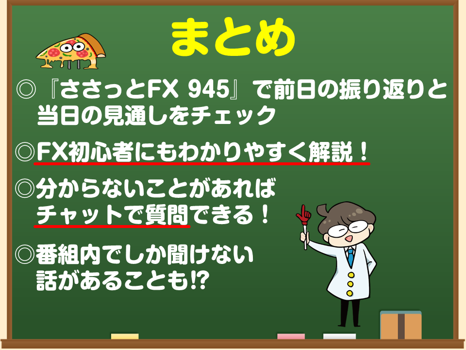 - たしかにその日の見通しですもんね!わかりました!ピザちゃんも「ささっとFX 945」を見て、脱FX初心者を目指します!