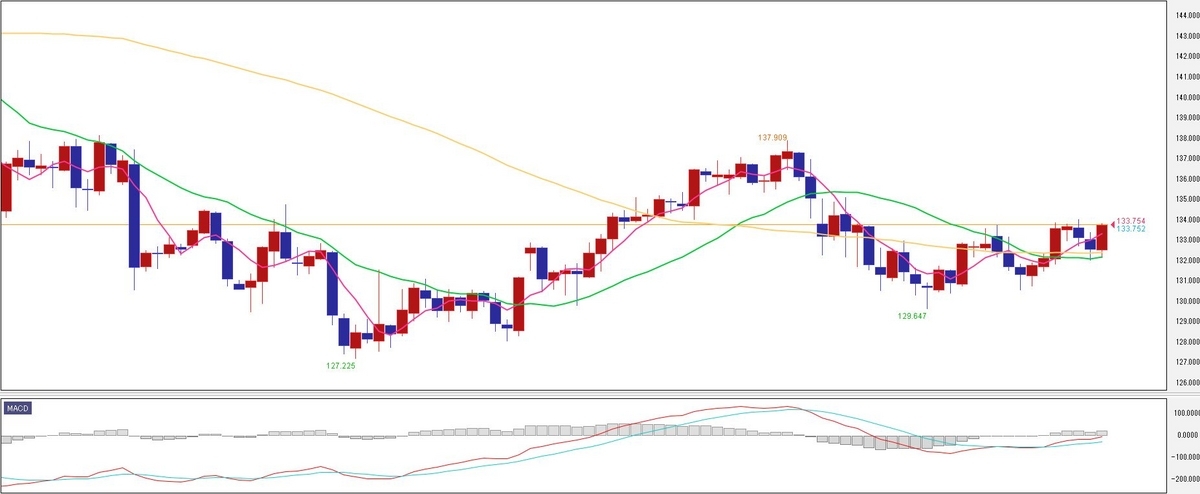 移動平均線は、3本とも上昇しました。実体線の居場所は概ね3本の移動平均線の上側を推移していて、どちらかというと買い方が有利の地合いといえるような気がします。MACDもわずかながら上 向き基調を維持していて、もう少しでゼロライン越えを果たしそうな状況となっていますね。狭いレンジ取引ながら若干ですが買い方に流れが傾き始めたと言ってよいのではないでしょうか。