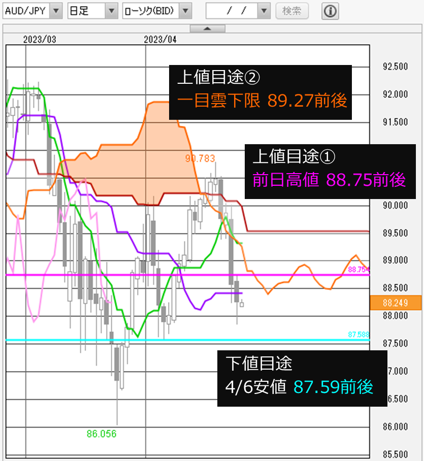 昨日発表された豪1-3月期CPIは前年比+7.0%となり、予想(+6.9%)を上回ったものの前回(7.8%)から豪州のインフレは大幅に鈍化していることを示した。また、RBAが重視するCPIトリム平均(変動幅の大きい15%と小さい15%をそれぞれ除外したもの)が+6.6%となり予想(+6.7%)以上に鈍化していた。これらの結果を受けて市場は5月2日のRBA理事会での利上げ再開の可能性がなくなったとの見方を強めた。金融政策の面から見ると豪ドルは対米ドルやユーロなどでは売られやすい状況となりそうだ。