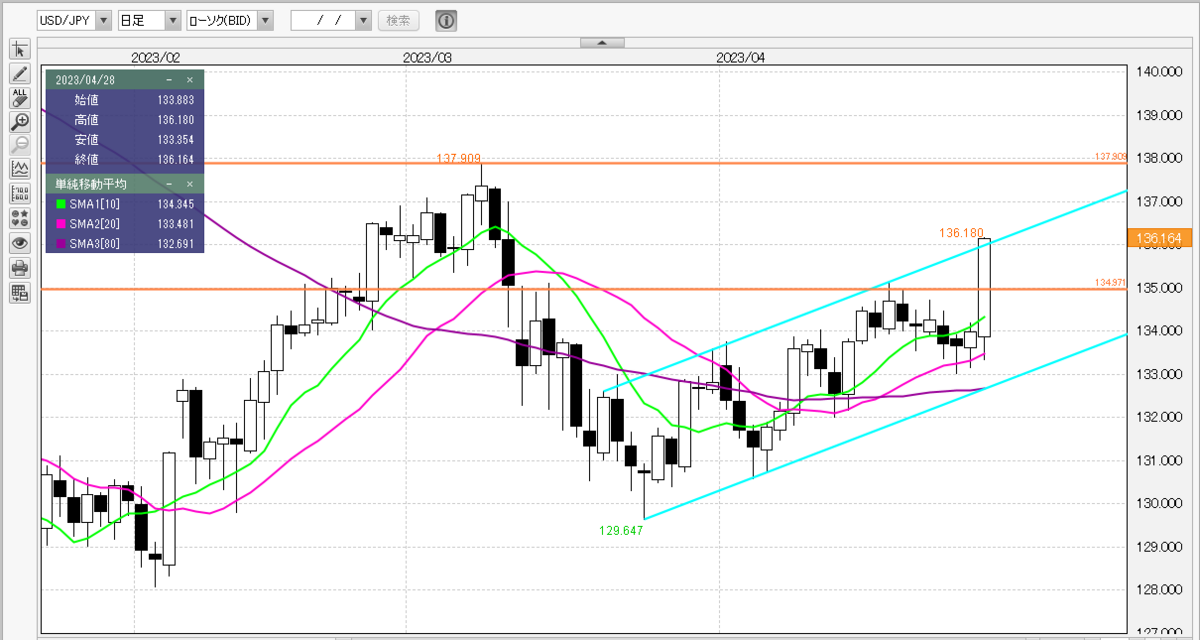 日足のチャートを見ると、10・20・80日移動平均線が上向きで乖離幅が広がる中で、約1カ月にわたる上昇チャネルを上抜けてきました。つまり、上昇の勢いが加速しているという事です。来週にでも年初来高値137.91円前後を試してもおかしくない値動きとなっています。ただ、執筆時点ではローソク足が確定しておらず、ふたを開けて見ると上ヒゲを伸ばしてチャネル内に戻っていることも考えられます。上抜けると更なる上値摸索へ、チャネル内に押し戻されれば、一旦135.00円前後まで調整が入り底堅さを確かめる展開も考えられます。そのため、終値ベースで方向感を確認して、来週の戦略を立てるようにしましょう。