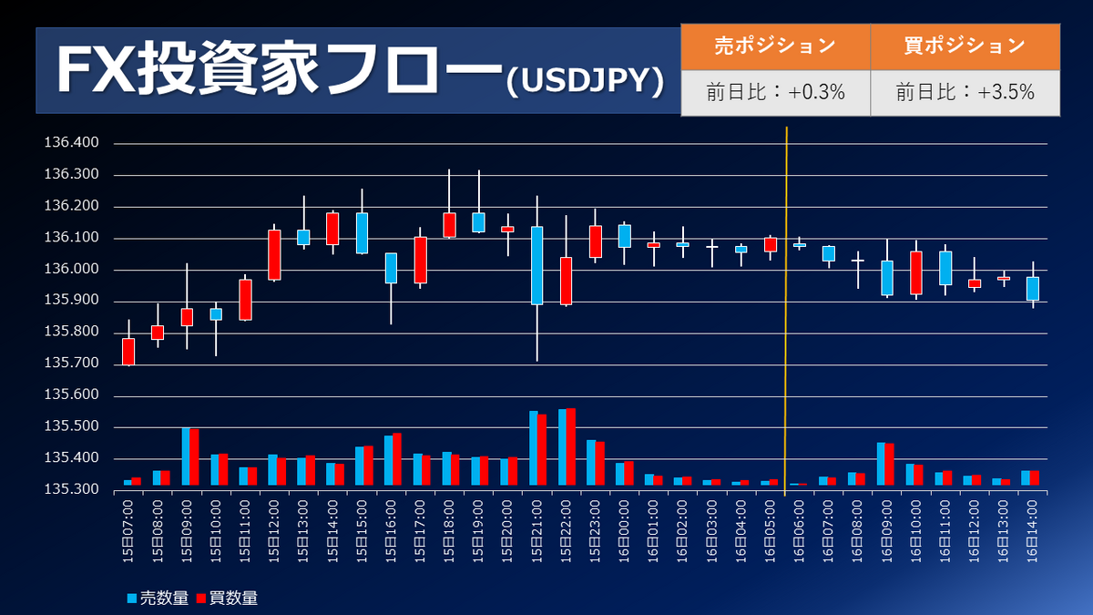 前日オープンから本日15時までのUSDJPYの値動き(ローソク足)と個人投資家動向です。(画面下のグラフは各時間帯ごとの個人投資家の売買を表しており、青いバーが売数量、赤いバーが買数量です。)