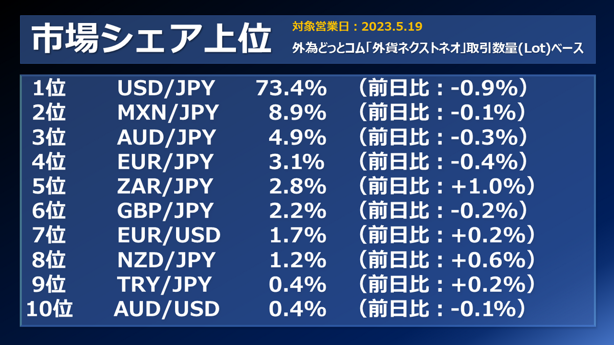 外為どっとコムのFX取引サービス「外貨ネクストネオ」取り扱い通貨30通貨ペアの内、取引量が多かった上位10位です。