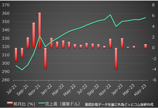 そして最後に29日に発表された豪5月小売売上高です。結果は前月比+0.7%で1月以来の大幅な伸びとなりました。しかし、5月はオンラインで大規模なセールイベントがあったことや前述の通り、サービスインフレが上昇したことなどが、小売売上高の増加の要因となった模様です。昨年11月も「ブラックフライデー」や「サイバーマンデー」と言った感謝祭前後の大規模なオンラインセールの影響で小売売上高が大きく伸びました。そして翌12月にはその影響から小売売上高は大幅に低下しました。そういった事例を見る限り、5月の好結果は単発的なものになる可能性が高いと考えられます。