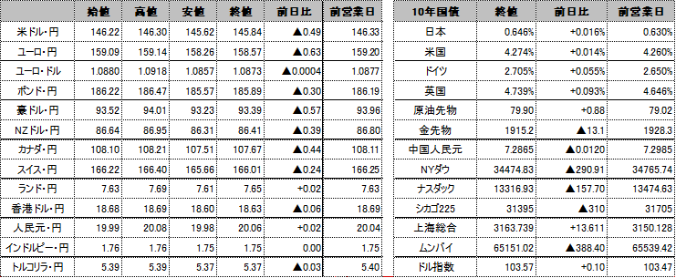 - ドル・円:株安を警戒してリスク回避の円買いが強まり、146円30銭から145円62銭まで円高・ドル安で推移。