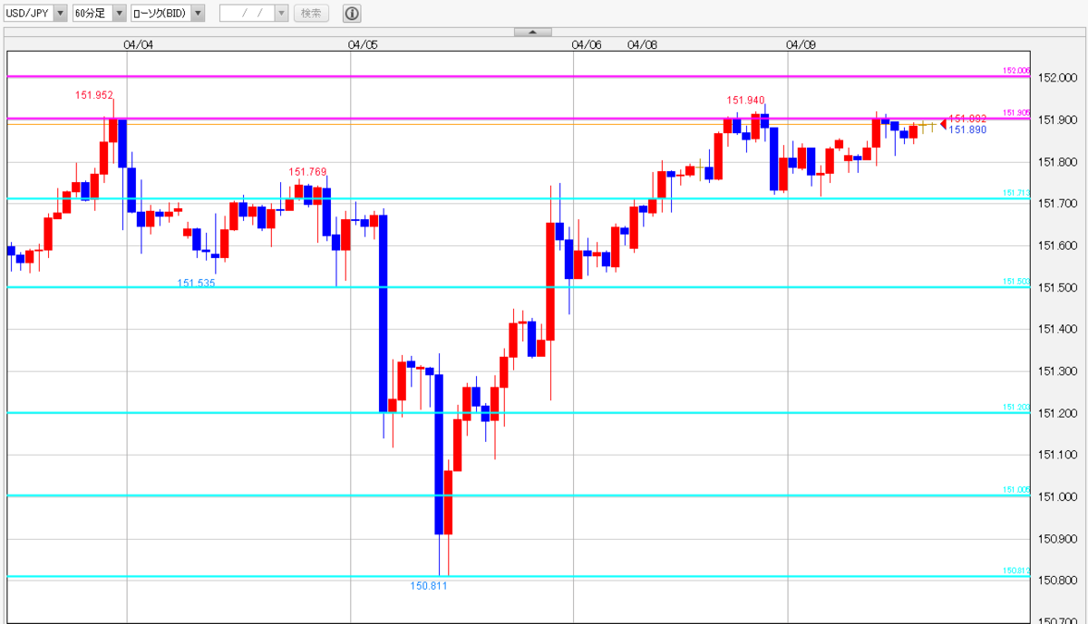 ②相場展開の予想・・・明日に米3月消費者物価指数(CPI)の発表を控えて本日も方向感の出にくい相場展開が想定されます。引き続き151円台のレンジを意識した取引を行っていきましょう。なお、152円を突破した場合は買い目線で考えて行きたい場面となりそうです。