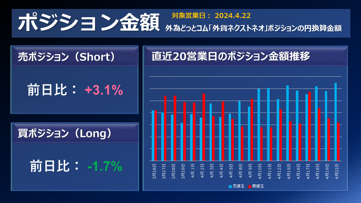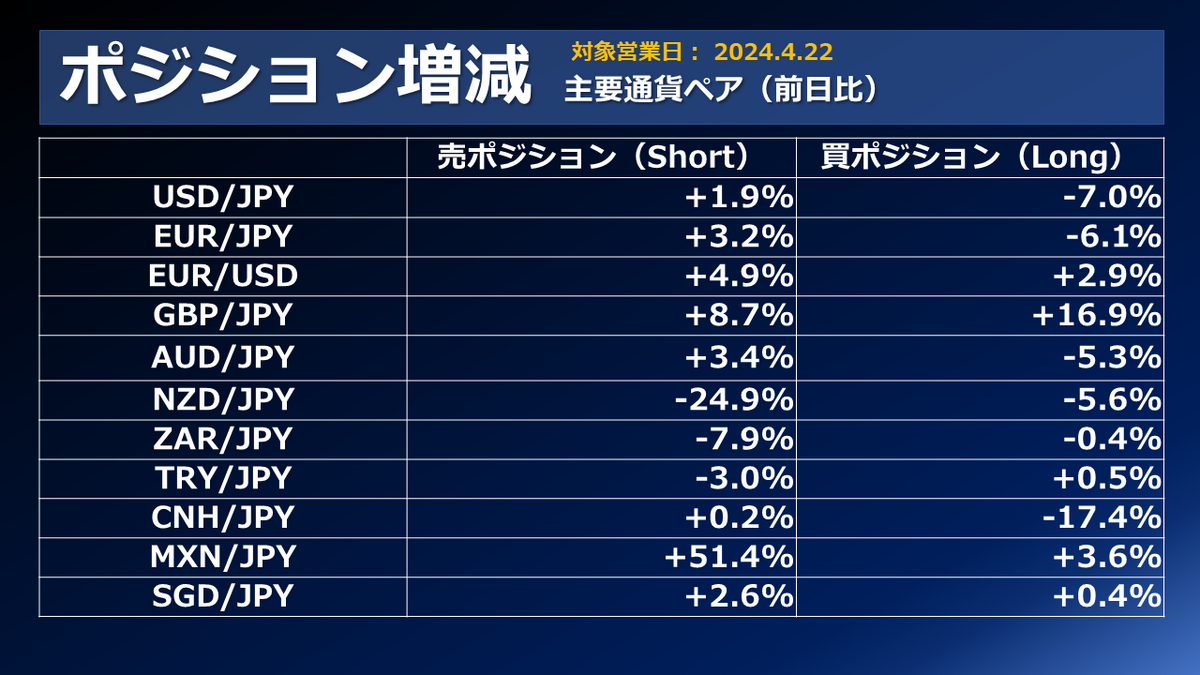 外為どっとコムのFX取引サービス「外貨ネクストネオ」主要通貨ペアのポジション増減(前日比)です。