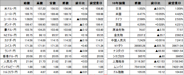 - ドル円:米国の良好な雇用やPMIを受け156円53銭から157円20銭まで円安ドル高で推移。