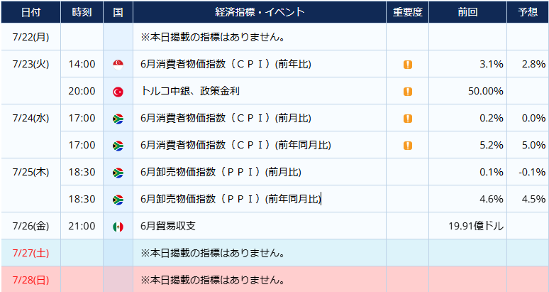 11日にカラハン・トルコ中銀総裁が早期利下げ観測を否定したこともあり、市場ではトルコ中銀が23日に政策金利を据え置くと予想されています。前回会合と変わらず引き締め姿勢を維持するかが焦点となるでしょう。