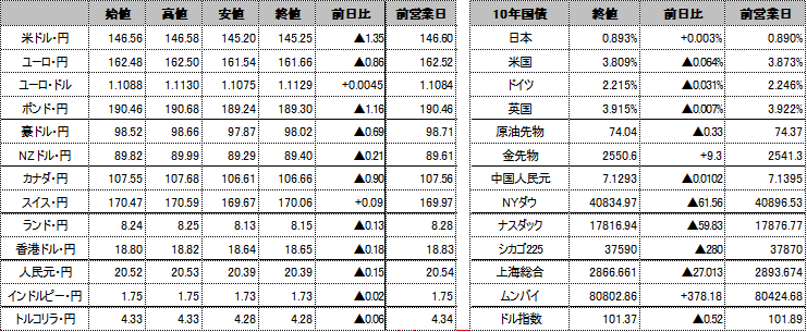 - ドル・円:日米金利差縮小観測に146円58銭から145円20銭まで円高・ドル安で推移。