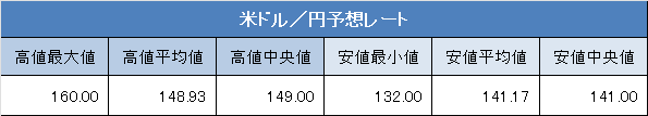 今後1カ月の米ドル/円相場の高値と安値の予想については、最高値が160.00円、最安値が132.00円となり、高値の平均値は148.93円、安値の平均値は141.17円であった。高値の中央値は149.00円、安値の中央値は141.00円だった。実勢レートが前回調査時(最終日)から11.6円程度切り下がったのに対して高値・安値の予想中央値も11~14円程度、円高・ドル安方向にシフトした。