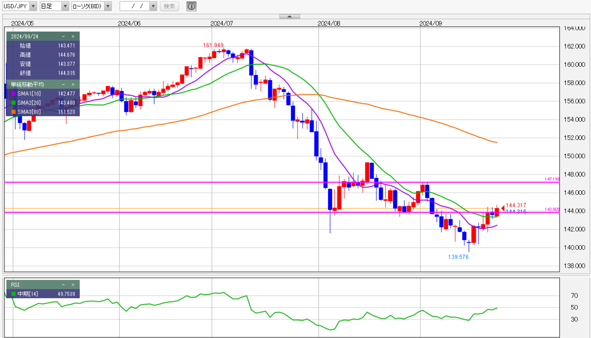 ドル/円をテクニカル分析で見ると、20日線をサポートに144円台後半へ持ち直す展開となっており、終値で144.00円を突破するようだと明日以降も底堅い値動きとなりそうです。その場合、9月高値147円台をターゲットとした値動きとなる可能性もあります。しかし、環境認識から下落基調が継続していると見れるため、持ち直しの動きは一時的であり再び反落することも考えられるため注意しましょう。