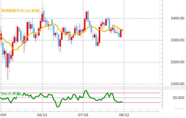 「CFDネクスト」での金(ゴールド)スポット価格について、テクニカル分析では単純移動平均線(10日)が下向きとなる中、価格は移動平均線上に位置している。相場の過熱感をはかるRSIは30付近で推移しており、売られすぎを示している。