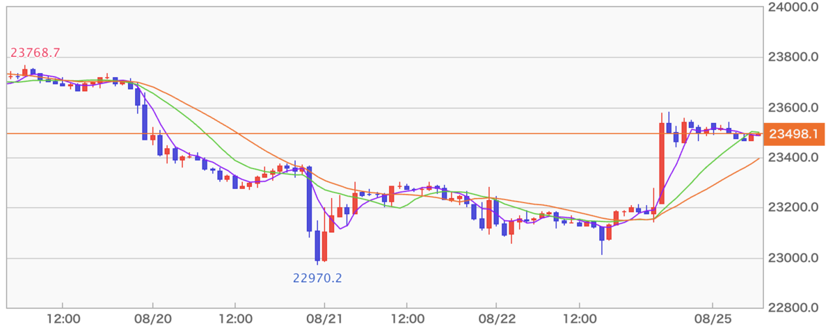 22日のドル/円の下げが146.57円処に留まり、8月14日の安値=146.21円処を試すまでには至らなかったということも見逃せない。振り返ると、14日の下げを演出したのは「FRBは0.5%ポイントの大幅利下げを実施すべき」、「日銀は利上げするだろう」と述べた前日のベッセント財務長官の発言である。つまり、ドル/円が一段の下値を試す展開になるためには、やはり何らかの材料が追加で必要になるということであり、その一つの候補が今週29日に発表される7月の米個人消費支出(PCE)価格指数の結果であることはあらためて押さえておきたい。