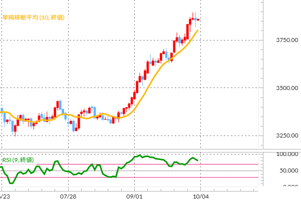 「CFDネクスト」での金(ゴールド)スポット価格について、テクニカル分析では単純移動平均線(10日)が上向きとなる中、価格は移動平均線より上に位置していることから上昇トレンドを示している。相場の過熱感をはかるRSIは、80付近で推移していることから、買われすぎを示している。