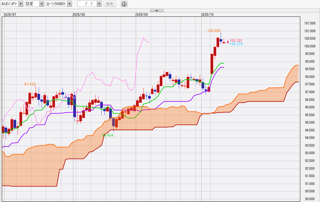 豪ドル/円は年初来高値を更新して、約11カ月ぶりに100円台に乗せています。上値目途は昨年11月20日高値の101.56円前後や同11月7日高値の102.40円前後が意識されそうです。一方下値は、9月1日以降日足一目均衡表の基準線がサポートとして機能しています。まずは同線を下抜けられるかが注目点となります。その下の水準では先週安値の(96.86円前後)が意識されそうです。