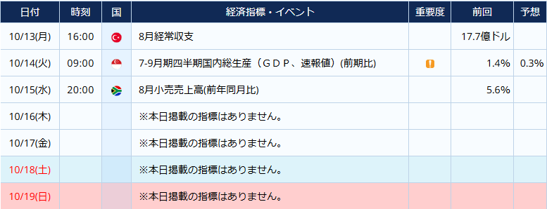 市場では、豪中銀(RBA)による年内追加利下げの可能性は五分五分と見られています。今後の利下げを巡り14日のRBA議事録や16日の豪9月雇用統計が材料視されそうです。その他、16日には田村日銀審議委員による講演が予定されています。9月日銀会合で利上げを主張した一人であるため利上げ時期を探るうえでどのような見解を示すか注目が集まります。