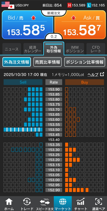 現状レベルの上側の153.500円、153.550円、153.600円、153.650円、153.700円、153.750円、153.800円、153.850円、153.900円に売りが観測されるほか、153.450円、153.500円、153.550円、153.600円、153.650円、153.700円にストップ買いが観測される。一方、下側では152.900円、153.000円、153.200円、153.300円に買いが見られるほか、153.000円、153.300円にストップ売りが確認できる。